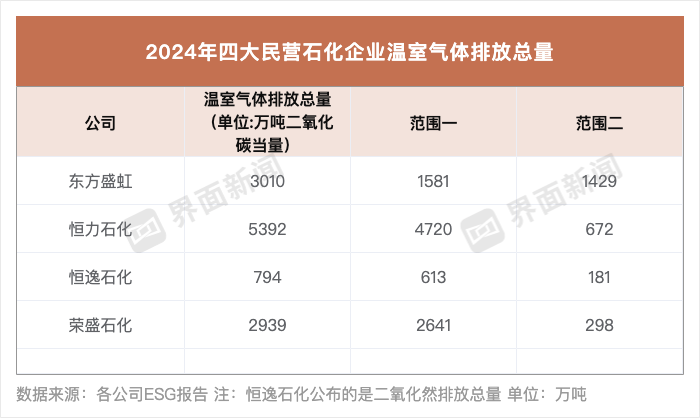 石化企业的碳排放备受瞩目。截至目前,四大民营石化企业恒力石化(600346.SH)、东方盛虹(000301.SZ)、荣盛石化(002493.SZ)、恒逸石化(000703.SZ)均发布了2024年度环境、社会和治理及可持续发展相关报告(下称ESG报告)。
