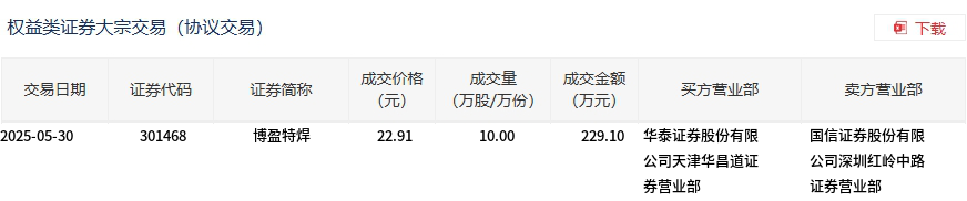 5月30日,博盈特焊大宗交易成交10万股,成交额229.1万元,占当日总成交额的1.75%,成交价22.91元,较市场收盘价23.14元折价0.99%。