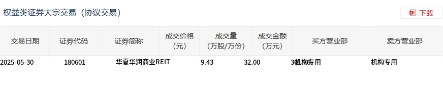 5月30日,华夏华润商业REIT大宗交易成交32万股,成交额301.76万元,占当日总成交额的12.11%,成交价9.43元,较市场收盘价9.638元折价2.16%。