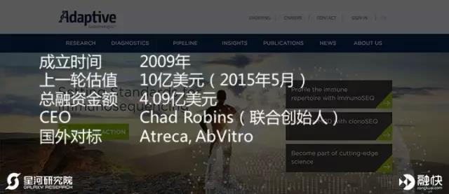 Adaptive Biotechnologies一直走在免疫疾病研究的最前沿,它结合高通量测序和专业的生物信息学来鉴定分析T细胞和B细胞受体,开发了ImmunoSEQ的免疫测定技术平台。现在世界上很多肿瘤学、自身免疫性疾病、基础免疫学等领域的实验室都在使用这个平台,进行关于癌症和其他免疫疾病的突破性研究。