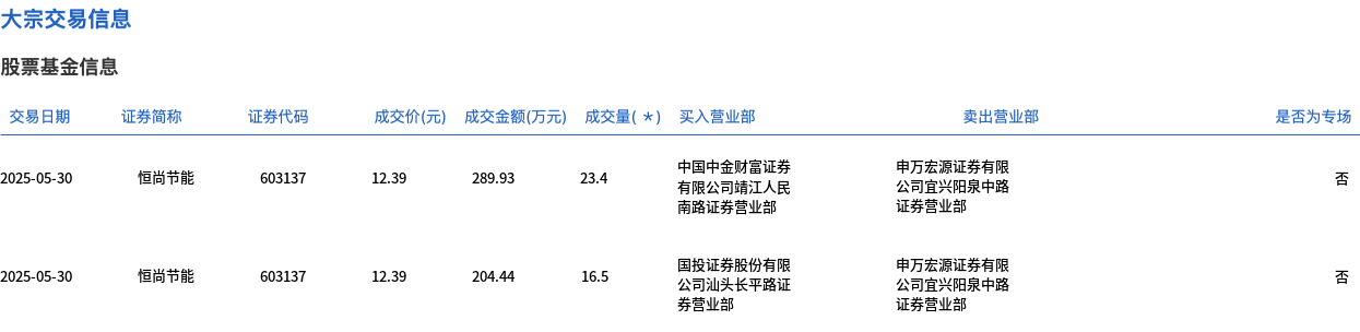 5月30日,恒尚节能大宗交易成交39.9万股,成交额494.37万元,占当日总成交额的11.24%,成交价12.39元,较市场收盘价13.57元折价8.7%。
