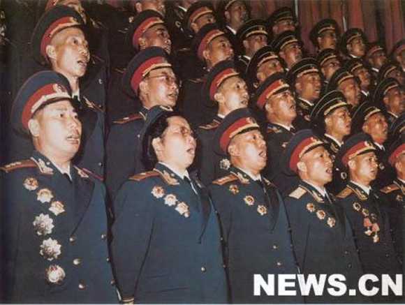 资料图片:1955年4月在中南海勤政殿陈列了新式军衔服装--55式军服。55式军衔服装经国务院第十八次会议批准,于1955年10月1日起开始配发。图为将军们身着55式军装合唱。