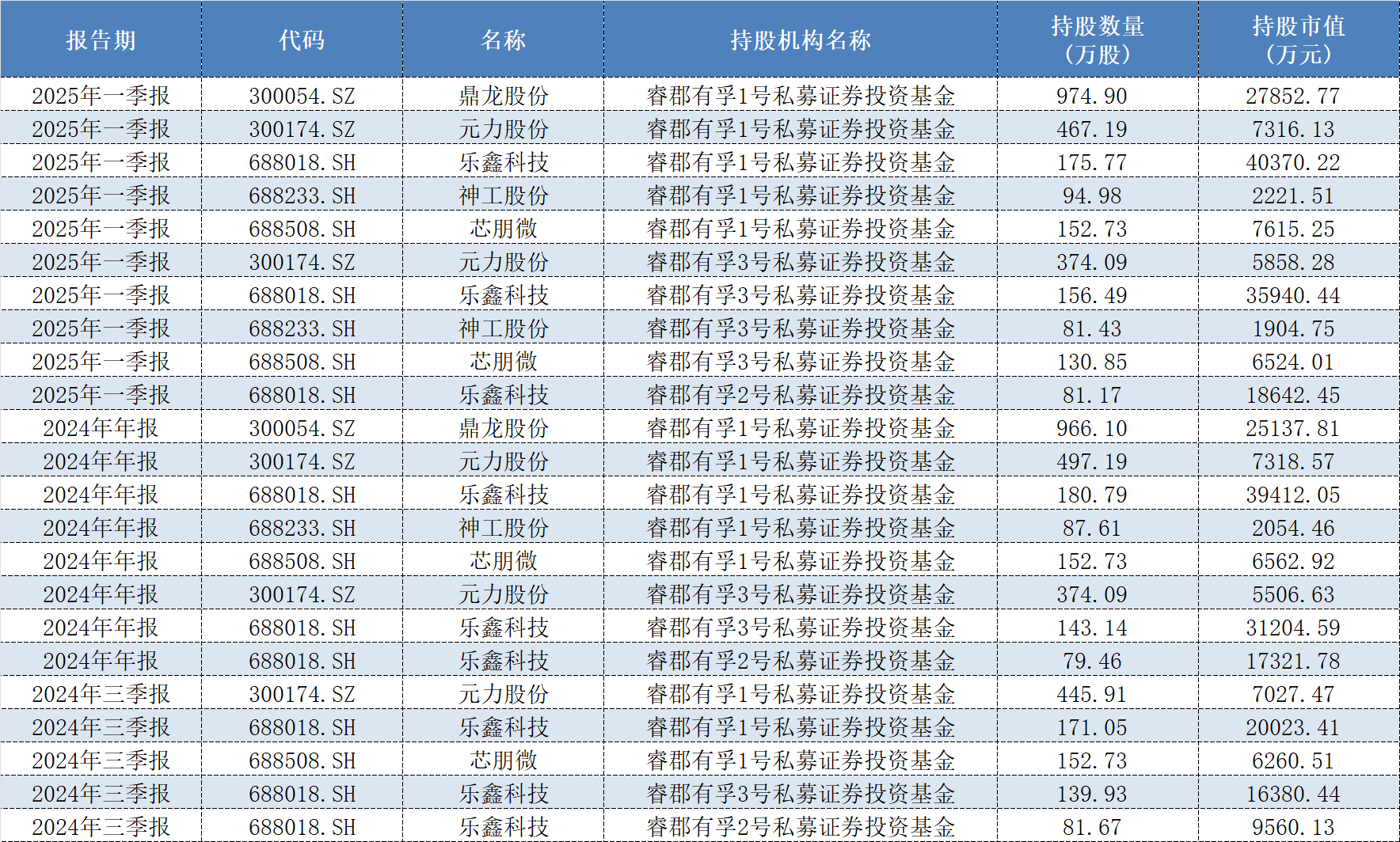 同年年报,“睿郡有孚系列产品”继续持有芯朋微,进一步加仓了元力股份、乐鑫科技,同时新进出现在鼎龙股份(300054.SZ)、神工股份(688233.SH)前十大流通股东中,期末持仓参考市值累计达13.45亿元。