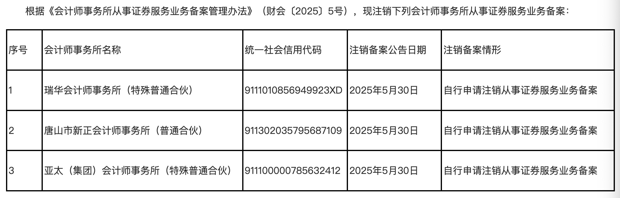 2025年4月,财政部、中国证监会修订《会计师事务所从事证券服务业务备案管理办法》,新增备案核验、公告和注销专章,明确会计师事务所出现依法终止、执业许可失效、自行申请注销备案等7类情形之一时,财政部、中国证监会将注销其从事证券服务业务备案并公告,推动形成有进有出、动态有序的备案管理格局。
