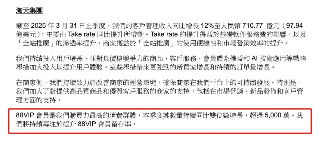 再看阿里。阿里2025年一季度财报后明确对外表示——淘天将持续专注于提升88VIP会员留存率。88VIP业务负责人此前透露,过去一年,淘宝88VIP持续保持双位数增长,成为国内最大规模电商付费会员体系。