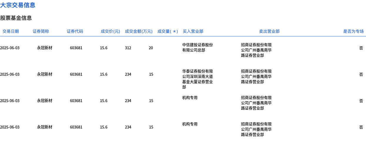 6月3日,永冠新材大宗交易成交65万股,成交额1014万元,占当日总成交额的4.08%,成交价15.6元,较市场收盘价18.65元折价16.35%。