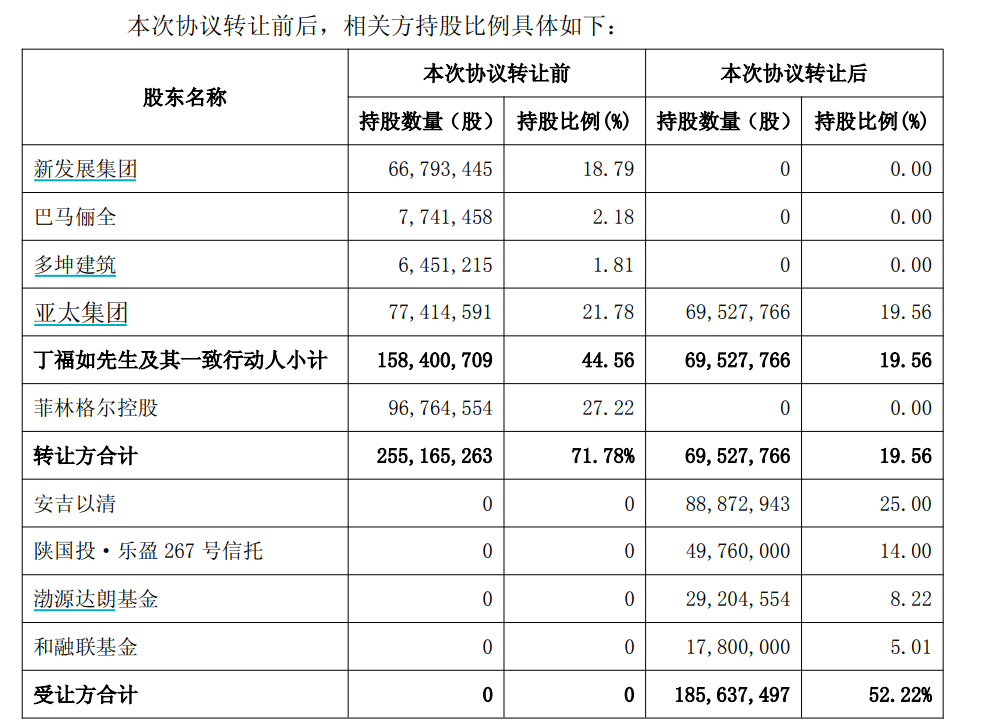同时,公司实际控制人丁福如及其一致行动人新发展集团、巴马俪全、多坤建筑、ASIA PACIFIC GROUPINTERNATIONAL LIMITED(下称亚太集团)与安吉以清科技合伙企业(有限合伙)(下称安吉以清)及其实际控制人金亚伟签署了《股份转让协议》。由实际控制人丁福如及其一致行动人,以7.88元/股的价格,合计向安吉以清及其实际控制人金亚伟协议转让 8887万股股份(占公司总股本的25%)及其各自对应的全部权益。