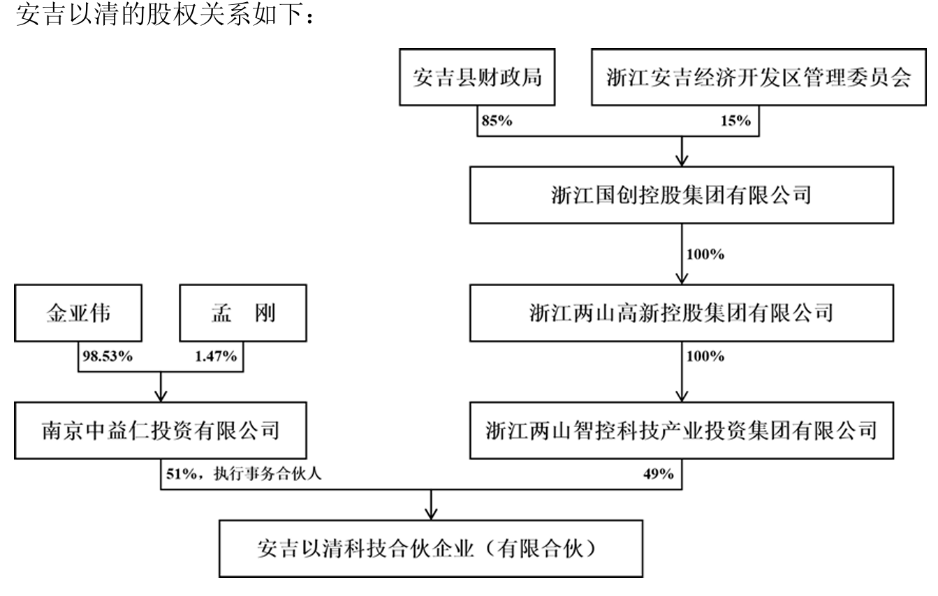 从安吉以清股权关系图中可以看到,金亚伟通过中益仁投资持有安吉以清51%,剩余49%由浙江两山智控科技产业投资集团持有。浙江两山智控科技产业投资集团背后则是安吉县财政局和安吉经济开发区管委会。