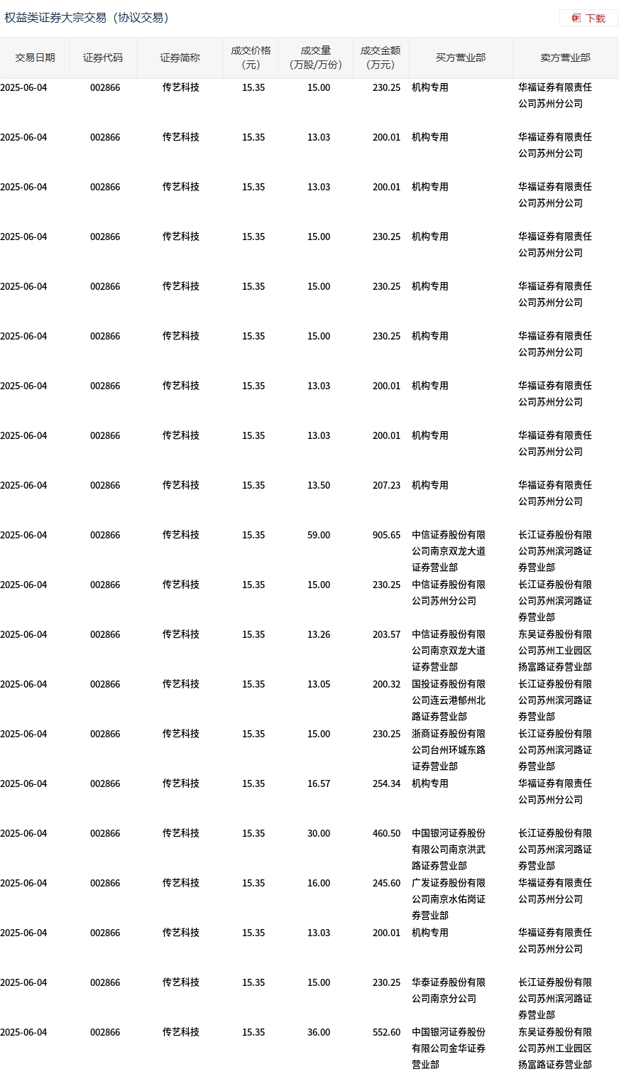 6月4日,传艺科技大宗交易成交578.83万股,成交额8885.06万元,占当日总成交额的18.47%,成交价15.35元,较市场收盘价17.64元折价12.98%。