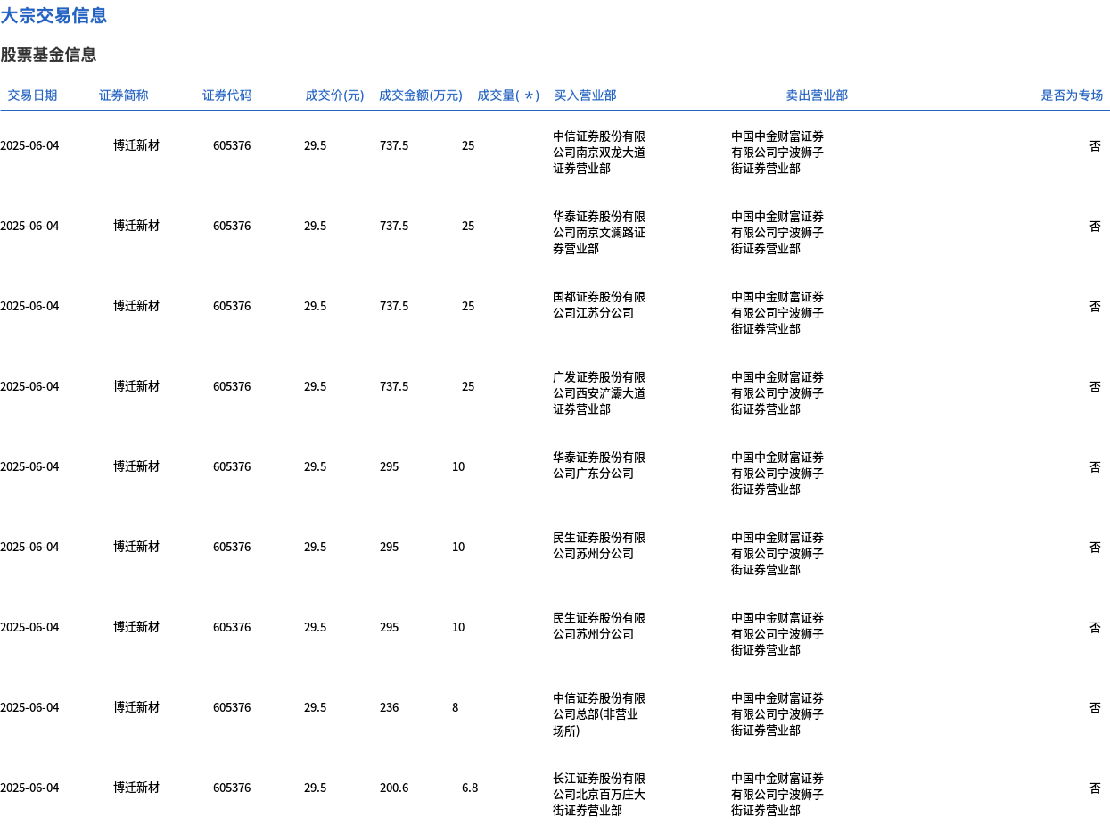 6月4日,博迁新材大宗交易成交144.8万股,成交额4271.6万元,占当日总成交额的27.67%,成交价29.5元,较市场收盘价32.63元折价9.59%。