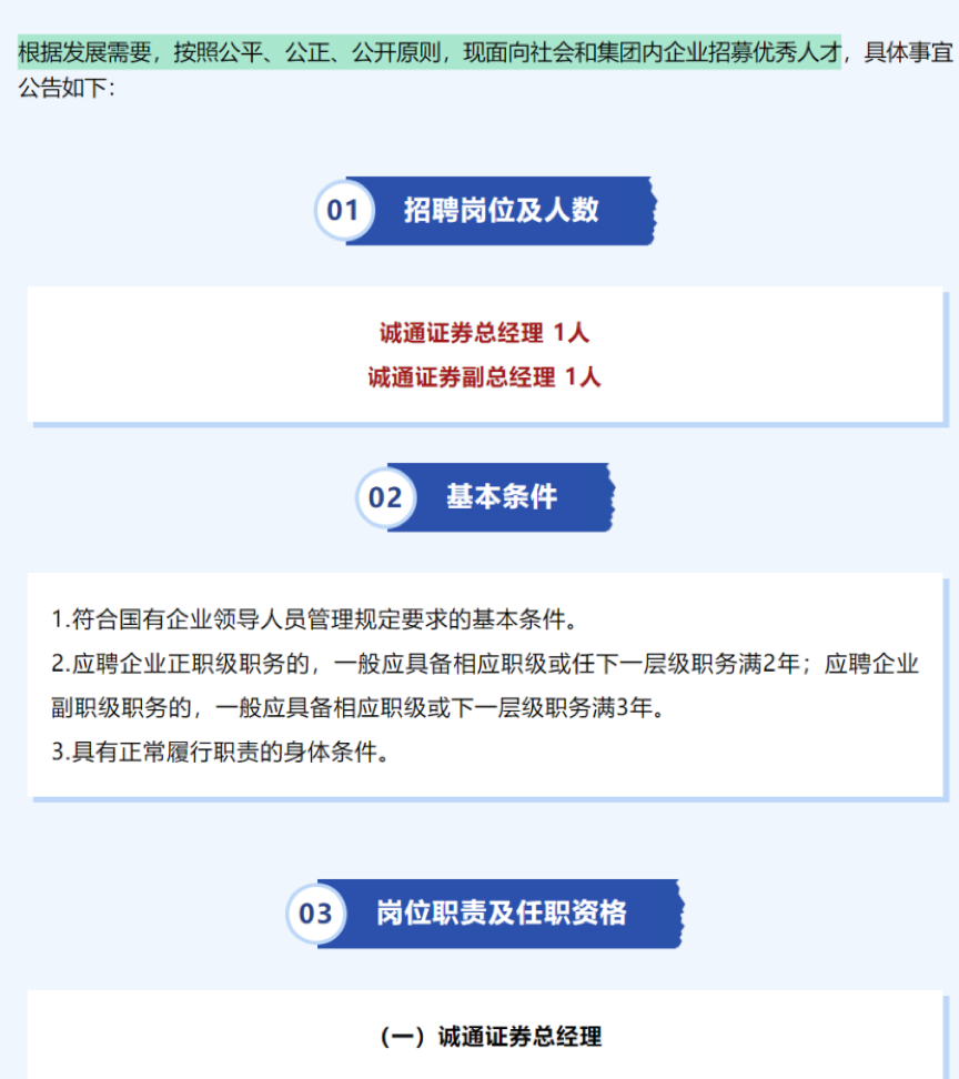 “此次招聘打破传统国企用人模式,更注重市场化选拔机制。”多位受访人士认为,诚通证券当前高管团队仅3人(含董事长),管理幅度较宽,补充专业人才将直接提升决策效率与业务推进力度。