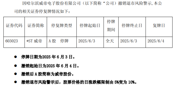 5月30日晚间,ST威帝公告称,公司申请撤销退市风险警示已获上海证券交易所批准。公司股票于6月3日停牌一天,自6月4日起复牌交易,证券简称由“ST威帝”变更为“威帝股份”,股票价格日涨跌幅限制恢复为10%。