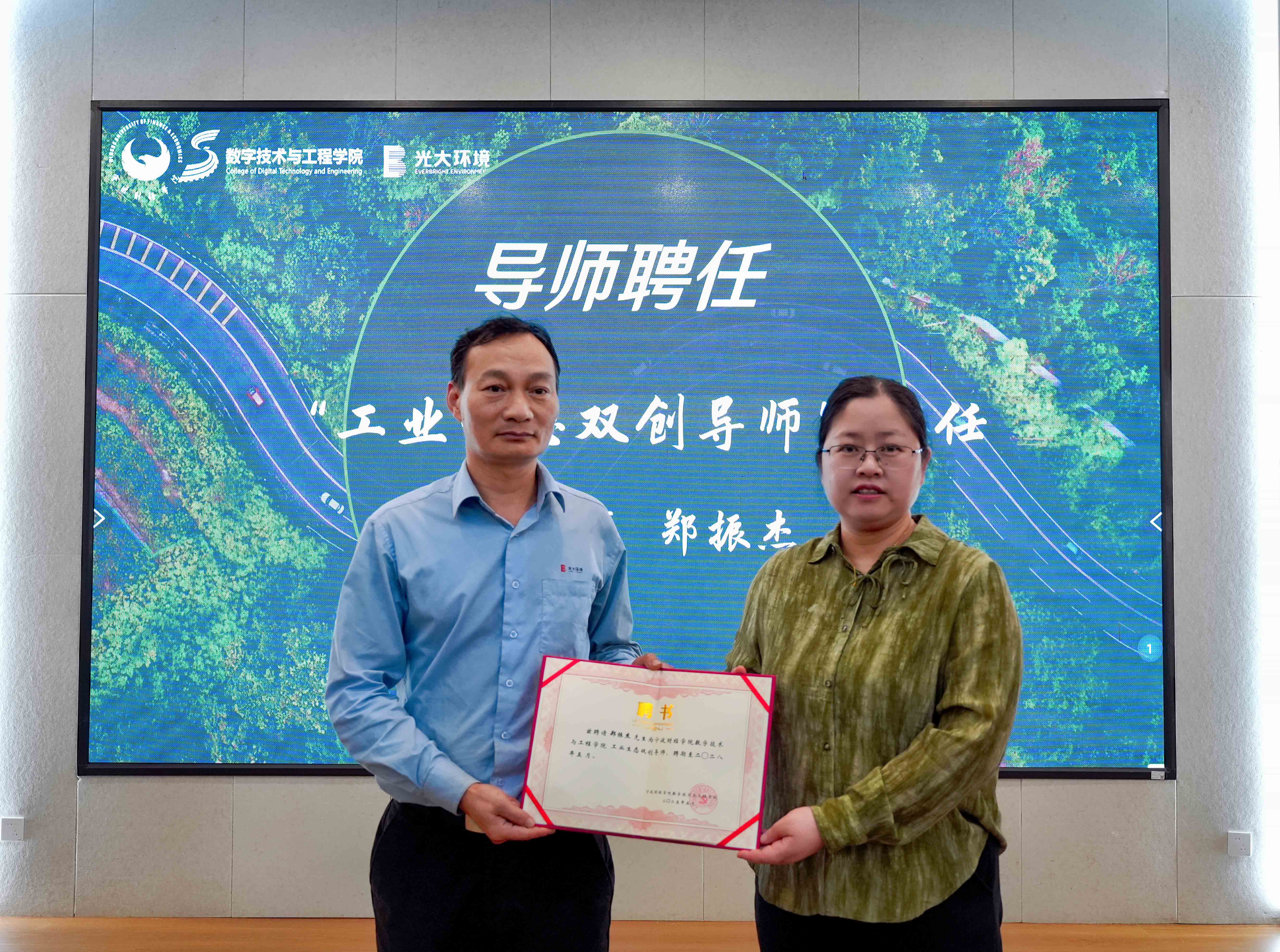 活动中邵霞琳代表学院,为“宁波工匠” 称号获得者、光大环境宁波公司技术专家郑振杰颁发“工业生态双创导师”聘书。郑振杰表示,愿做桥梁把企业一线的经验传递给学生,让他们知道,绿色发展不仅是口号,更是需要用技术和智慧去践行的使命。