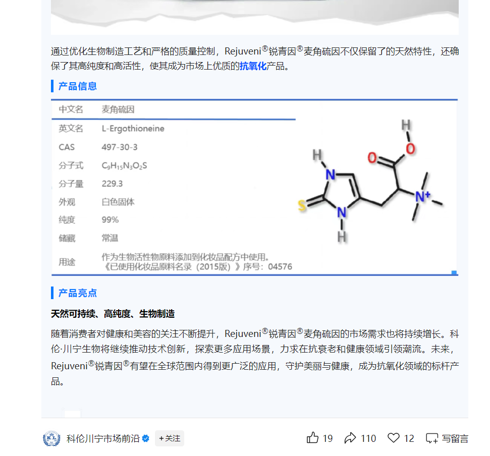 另外, 麦角硫因能否口服尚且存疑。据前述川宁生物介绍麦角硫因的文章,末尾处截图显示该麦角硫因的用途是作为生物活性物原料添加到化妆品配方中使用。