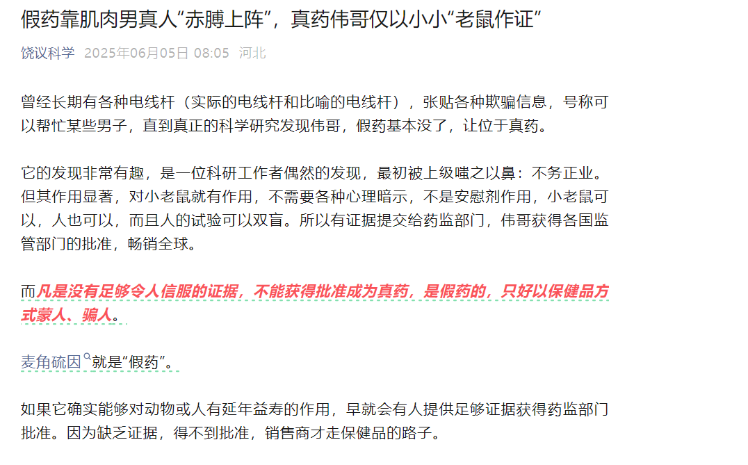 不过在6月5日,知名生物学家、前首都医科大学校长、现任北京大学校务委员会副主任、理学部主任饶毅在其公众号“饶议科学”上发布标题为《假药靠肌肉男真人“赤膊上阵”,真药伟哥仅以小小“老鼠作证”》的文章,称“麦角硫因就是‘假药’”。