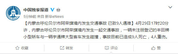 记者从内蒙古自治区安监局获悉,4月29日17时20分许,内蒙古呼伦贝尔市阿荣旗境内发生一起交通事故,目前已造成9人死亡,4人重伤。
