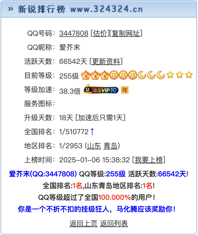 该账号注册于2000年,最初由“爱芥末”的父亲使用,后由其继承。来自第三方的QQ等级排行榜数据显示,“爱芥末”所使用的QQ账号活跃天数达66504天,用户位于山东青岛,其开通了超级会员(SVIP)等加速服务。无论是全国排名还是地区排名,“爱芥末”目前均处于第一位。