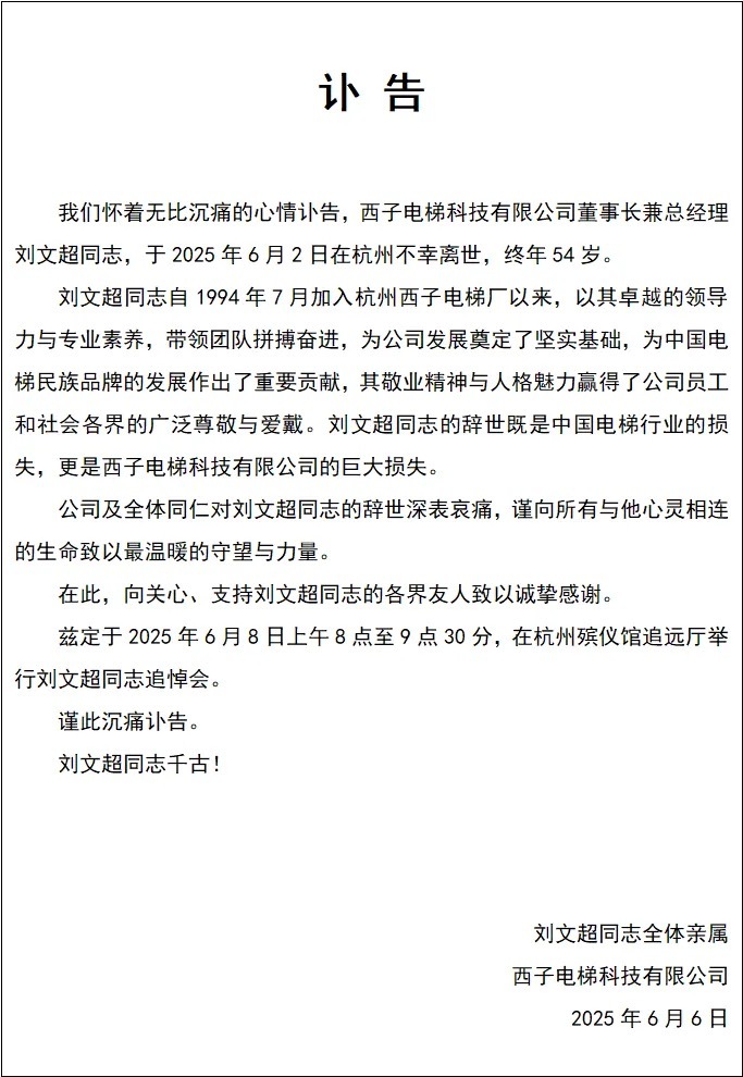 6月6日,西子电梯科技有限公司发布讣告称,公司董事长兼总经理刘文超,于2025年6月2日在杭州不幸离世,终年54岁。目前该公司官网已变成灰色页面。