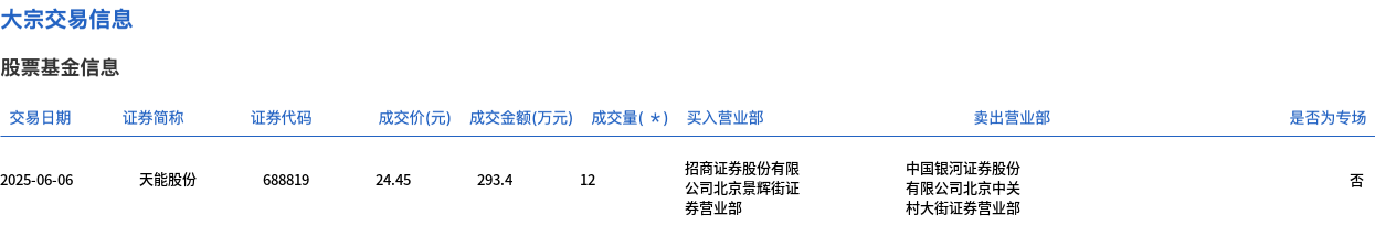 6月6日,天能股份大宗交易成交12万股,成交额293.4万元,占当日总成交额的9.52%,成交价24.45元,较市场收盘价26.01元折价6%。