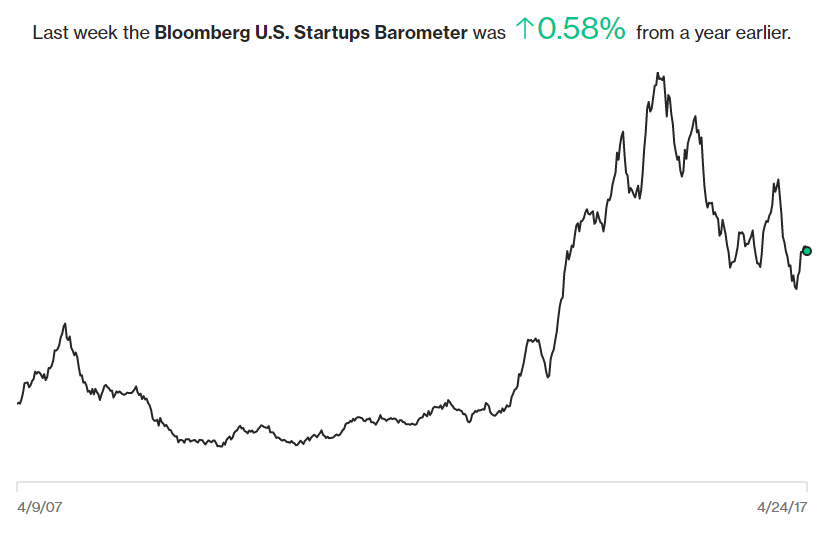 “彭博美国创业晴雨表”(Bloomberg U.S. Startups Barometer)的指数与去年同期相比上涨了0.58%,这是2015年以来首个同比增长,更大的融资交易总额和更多的退出案例促成了指数上涨,包括在近几周内上市的Snap和MuleSoft。