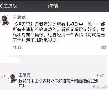 不仅如此,主角鹿晗和古力娜扎的演技也并不出彩。平心而论,鹿晗的表演经过《盗墓笔记》《重返20岁》等电影的磨练,已经灵动了许多,但仍然撑不起大男主的气场。而古力娜扎除了美成花瓶之外,和鹿晗之间的化学反应更像姐弟,丝毫没有让人看完心里直冒爱的泡泡。连国民老公王思聪都忍不住吐槽说,《择天记》是他看过的电视剧里,唯一一部所有主角都不会演戏的。