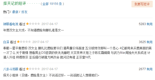 不过,只要有爱豆们出演的戏,就少不了粉丝的身影,她们除了肩负起爱豆和剧的网络热度,还要与我们这些“恶势力”作斗争,5星好评刷起来,控评、占精选、净化,一个都不能少。所以在这两部剧中,我们清晰地看到粉丝与一般观众对立起来,这种对峙外化为C型评分――他们用五星与一星的评分相互角力,形成着两个“互不可见”的群体。当然偶尔也会在各自的评论里企图说服对方。