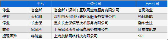 2016年9月,天源迪科、新纶科技先后宣布转让深圳市鹏鼎创盈金融信息服务股份有限公司全部股权,后者运营着鹏金所平台。除此之外,佳士科技(300193.SZ)、奥拓电子(002587.SZ)、华鹏飞(300350.SZ)三家也分别于2016年9月公告各减持所持的一半股份。