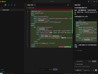 在Cursor中输入“帮我生成一个俄罗斯方块小游戏”的命令,很快进入思路创作和代码建立,但由于中间思考过程时长略长,导致在2分钟后才得到一个HTML+js文件。