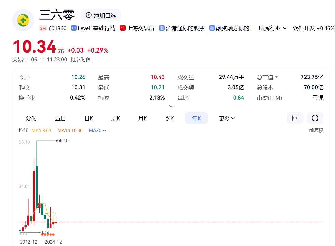 最重要的是,360集团已经连续第三年亏损,2022年至2024年,亏损额合计高达37.9亿元。股价也从66元/股的高光时刻,跌倒现在10元/股。