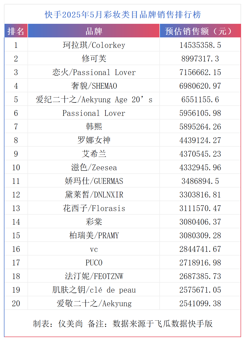 与抖音类似,快手平台的彩妆类目品牌销售TOP20排行榜中,也以国货品牌为主,不过在业绩表现上,依旧相对乏力。比如5月蝉联“冠军”的珂拉琪,预估销售额为1453万元,是快手平台唯一破千万的彩妆品牌。