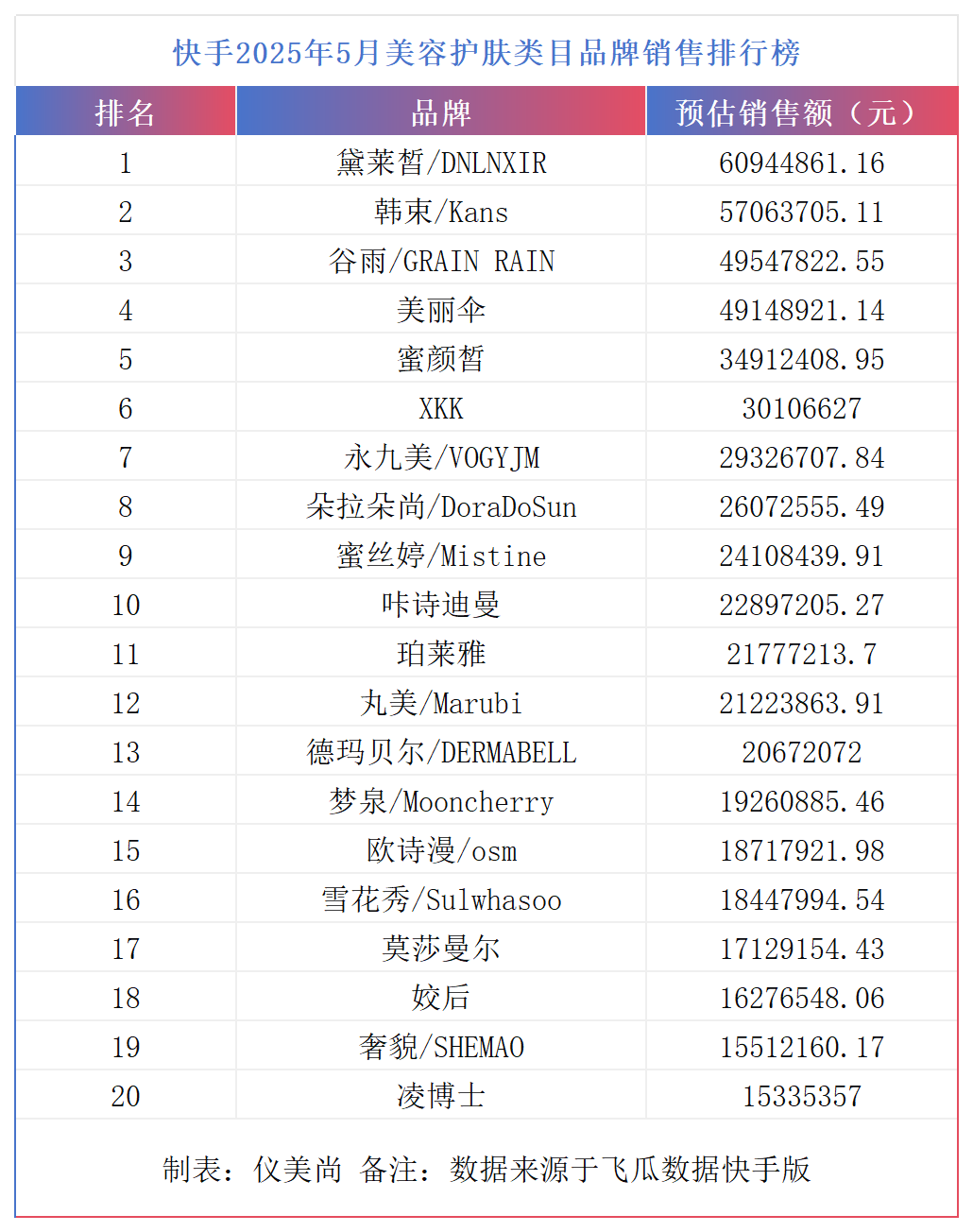 在快手美容护肤类目品牌销售额TOP20排行榜上,时隔多月,黛莱皙再度夺回“冠军”之位,以6094万元的预估销售额位居TOP1。不过,相较4月位居第一的谷雨,彼时创下9878万元的预估销售额,此番快手类目第一的“含金量”大幅降低。