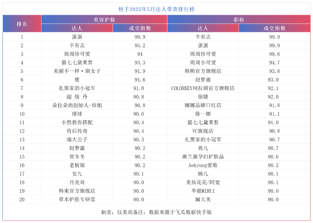 在达人带货方面,广东夫妇时隔5个月后,再次成为抖音电商美容护肤类目的“带货王”,而一度拿下“三连冠”的韦雪,此次则跌至第25名。快手则变化不大,稳据榜单前列的带货达人,依旧是辛巴 辛有志和蛋蛋师徒。