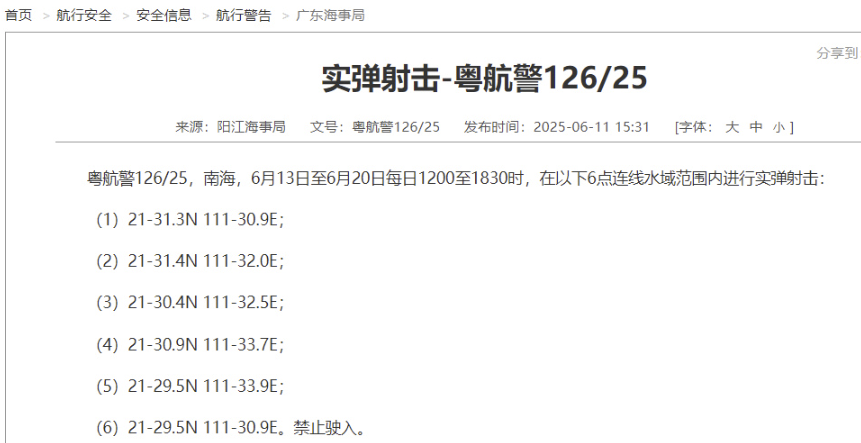据中国海事局网站消息,阳江海事局发布航行通告,6月13日至6月20日每日12时至18时30分,南海部分海域进行实弹射击,禁止驶入。