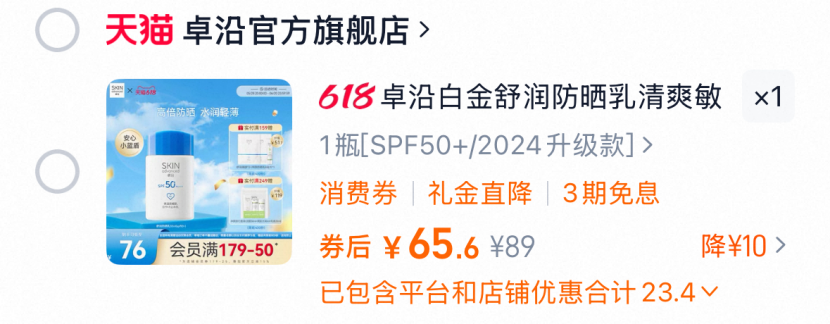 天猫SKIN卓沿官方旗舰店显示,屈臣氏同款防晒产品的优惠前价格为89元,优惠后价格为65.6元,比屈臣氏店里购入的价格便宜了83.4元。然而,当问及该产品原价时,天猫旗舰店客服表示没有原价金额数据。对此,「创业最前线」就该产品定价透明度问题,向屈臣氏发出采访函询问,截至发稿未获回复。