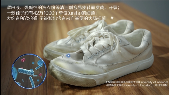 据澎湃新闻报道,美国亚利桑那大学一则研究数据显示,鞋上可能携带的病原体多达40余万种。此外,96%鞋底可以检测到大肠杆菌,后者则是临床处理十分棘手具有致病性的病原微生物。[i]鞋子清洁是日常必需,鞋子的清洁保养却一直困扰着消费者,鞋子“洗不净”“有损伤”“有异味”等问题常被诟病。