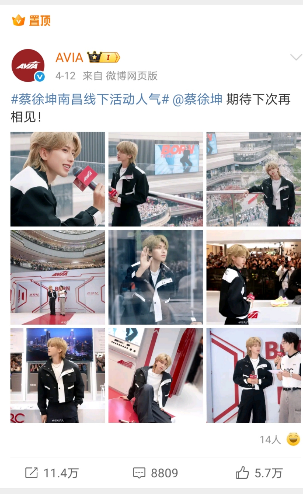 蔡徐坤的签约是AVIA中国运营方第一次吃到流量的甜头。签约蔡徐坤之前,该品牌的微博互动量常常停留在个位数甚至零评论。蔡徐坤成为AVIA全球品牌代言人后,局面瞬间逆转。粉丝带来的流量惊人:只要与蔡徐坤相关的内容均能获得至少过千评论和转发。今年4月份蔡徐坤参加AVIA线下活动的微博截至发稿前还被品牌置顶,转发过10万。如此数据表现,鼓励了AVIA签下第二位流量明星鞠婧祎。