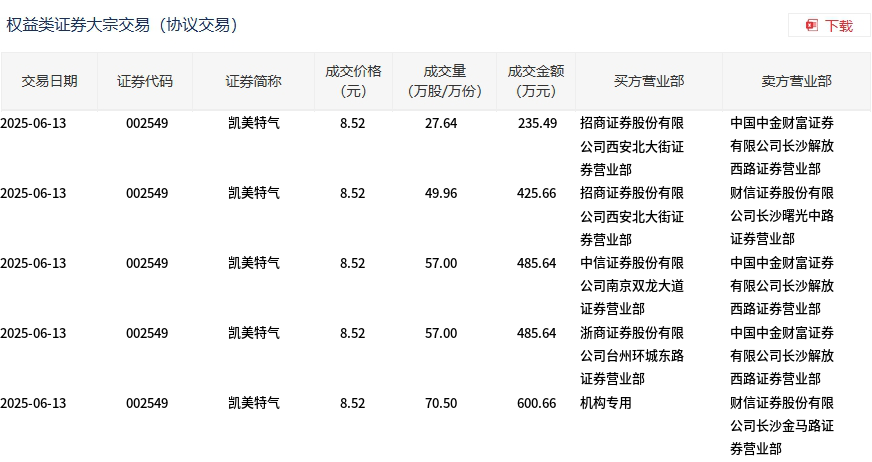 6月13日,凯美特气大宗交易成交262.1万股,成交额2233.09万元,占当日总成交额的4.43%,成交价8.52元,较市场收盘价9.5元折价10.32%。