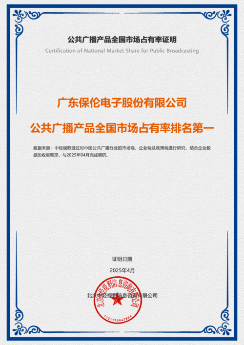 近日,广东保伦电子股份有限公司(简称“itc保伦股份”)在中经视野发布的《2024年中国公共广播TOP10企业市场占有率排名》调研报告中,凭借卓越的产品实力与行业领先的品牌影响力,斩获“公共广播产品全国市场占有率排名第一”殊荣。这一成果不仅印证了itc保伦股份在行业内的标杆地位,更充分展现了其品牌综合实力与强劲的市场竞争力。