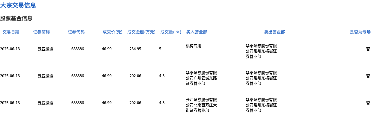6月13日,泛亚微透大宗交易成交13.6万股,成交额639.07万元,占当日总成交额的3.1%,成交价46.99元,较市场收盘价53.3元折价11.84%。