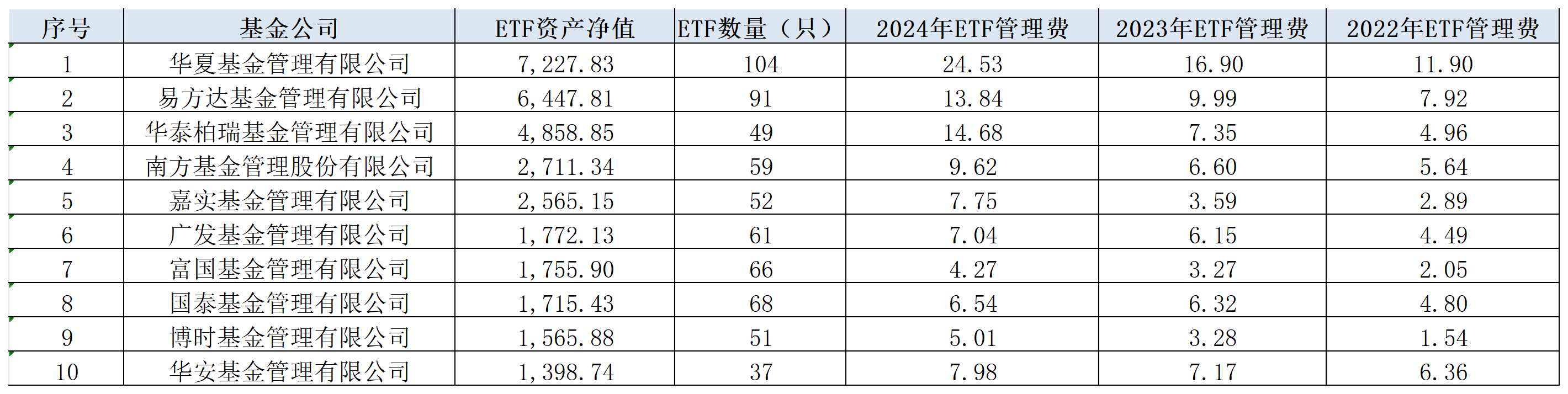 对比2022年-2024年的ETF管理费可以看到,随着ETF资产净值规模的创新高,公募管理人从ETF收取的管理费用也同比大幅提升。以华夏基金为例,2022年—2024年,该公司ETF的管理费用分别为11.9亿元、16.9亿元、24.53亿元。
