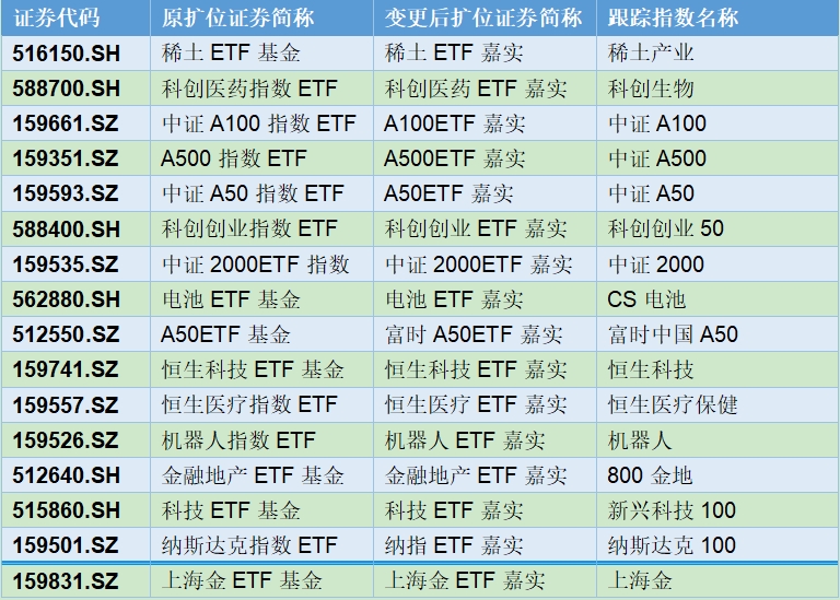 6月16日,嘉实基金公告称,自6月17日起,将对旗下22只产品进行集体更名,涉及中证A500、中证A100、A50ETF、稀土、医药、黄金等多只核心宽基和行业主题类ETF。