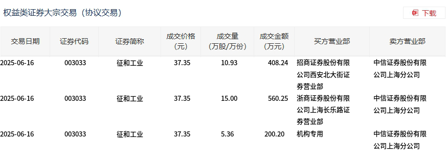 6月16日,征和工业大宗交易成交31.29万股,成交额1168.69万元,占当日总成交额的19.34%,成交价37.35元,较市场收盘价41.67元折价10.37%。