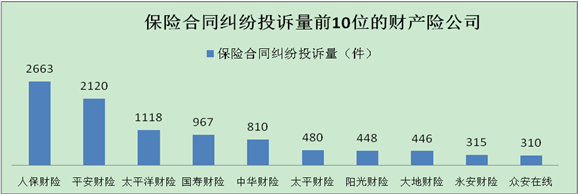 上述10家财产险公司合同纠纷投诉量居前,大部分公司投诉量排名与市场份额排名正相关。财险业龙头人保财险和平安财险一季度投诉量均超过2000件,太平洋财险和国寿财险以千件投诉量紧随其后,其余排进前十的中型财险公司投诉量多在400件至500件。值得注意的是,市场排名25位的众安在线投诉量达到310件,排进前十位。