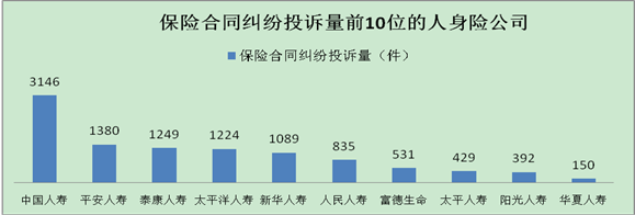 人身险公司合同纠纷排名前十的公司情况差异较大,中国人寿投诉量超过3000件,高居第一。投诉量排在2-5位的公司投诉量在千件水平,值得注意的是,原保险保费收入排名第十的泰康人寿,投诉量却排进前三。