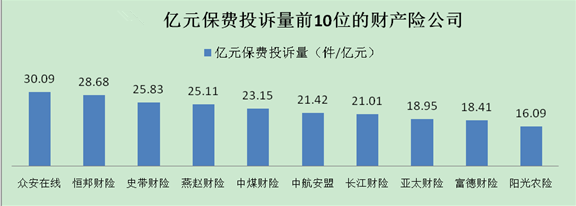 2017年一季度,财产险公司亿元保费投诉量平均值为4.80件/亿元。排名前十多是保费收入偏少的小型险企,多为外资险企。亿元保费投诉量最高的是众安在线,达到30.09件/亿元。此外还有恒邦财险、史带财险、燕赵财险、中煤财险、中航安盟和长江财险在20件/亿元以上。