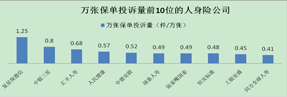 一季度人身险公司万张保单投诉量平均值为0.15件/万张。排名靠前的公司多为外资险企,复星系旗下复星保德信以1.25件/万张排位第一。