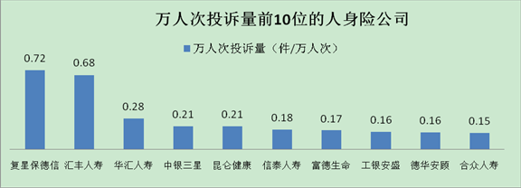 此外,万人次投诉量是人身险公司独有的消费者投诉指标,一季度平均值为0.03件/万人次。复星保德信继续居于榜首。