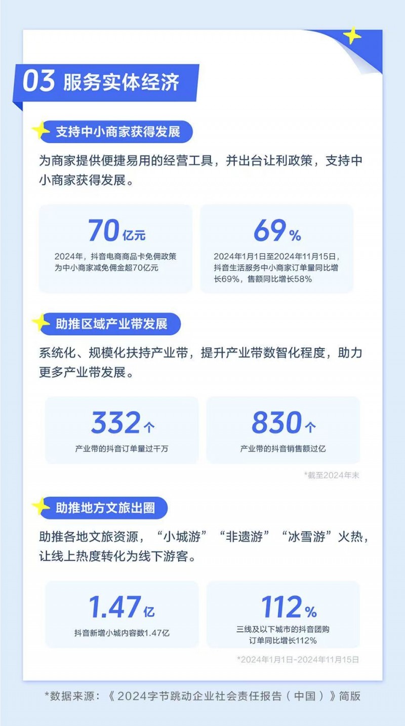 又如,借助平台优势,字节跳动持续运用直播等技术,激发经济动能、促进乡村振兴。近些年,各地都在提营商、促消费、促文旅出圈。在服务实体经济上,2024年,抖音电商为中小商家减免佣金超70亿元。中小商家经营成本减了、负担轻了、信心足了。在乡村振兴上,依托抖音及其内容生态,好产品和好风光批量“出圈”。大批新农人、商家涌现,让农产品走出去;众多小城、村落走红,让游人走进来。2023年9月至2024年9月,抖音电商累计销售农特产品71亿单;2024年全年,抖音“美好乡村等你来”乡村旅游数字提升行动带来游客2265万人次。企业服务实践的思路不断创新,以科技手段助力线上线下市场消费,体现出的正是一份沉甸甸的企业责任。
