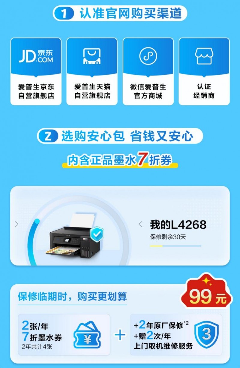 爱普生已构建完善的正品销售网络,购买正品墨水请认准京东、天猫官方旗舰店或“爱普生官方商城”微信小程序。为了让消费者买得放心、买得超值,爱普生还为消费者准备了优惠购买墨水攻略:查看打印机保修期,抓住窗口期购买“安心保”,不仅可以享受延保服务*2,更有7折墨水优惠券可领取,购买墨水更便宜!