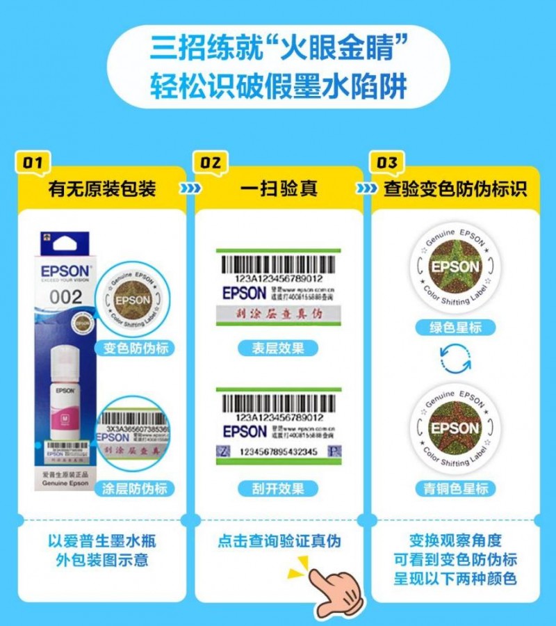 在辨别耗材方面,爱普生提供简单易行的三步法:一看包装,二查标识,三验密码。正品耗材外盒为彩色印刷,封口处贴有独特的“变色防伪标”,轻轻倾斜角度即可看到青铜色与绿色星光交替闪烁的效果;而假冒产品往往包装粗糙,甚至直接使用无标识的简易塑封。